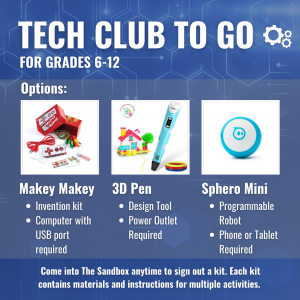 Come by The Sandbox Makerspace to borrow a tech kit with materials for several projects. We will provide links to our Youtube channel where you can find instructions for completion.