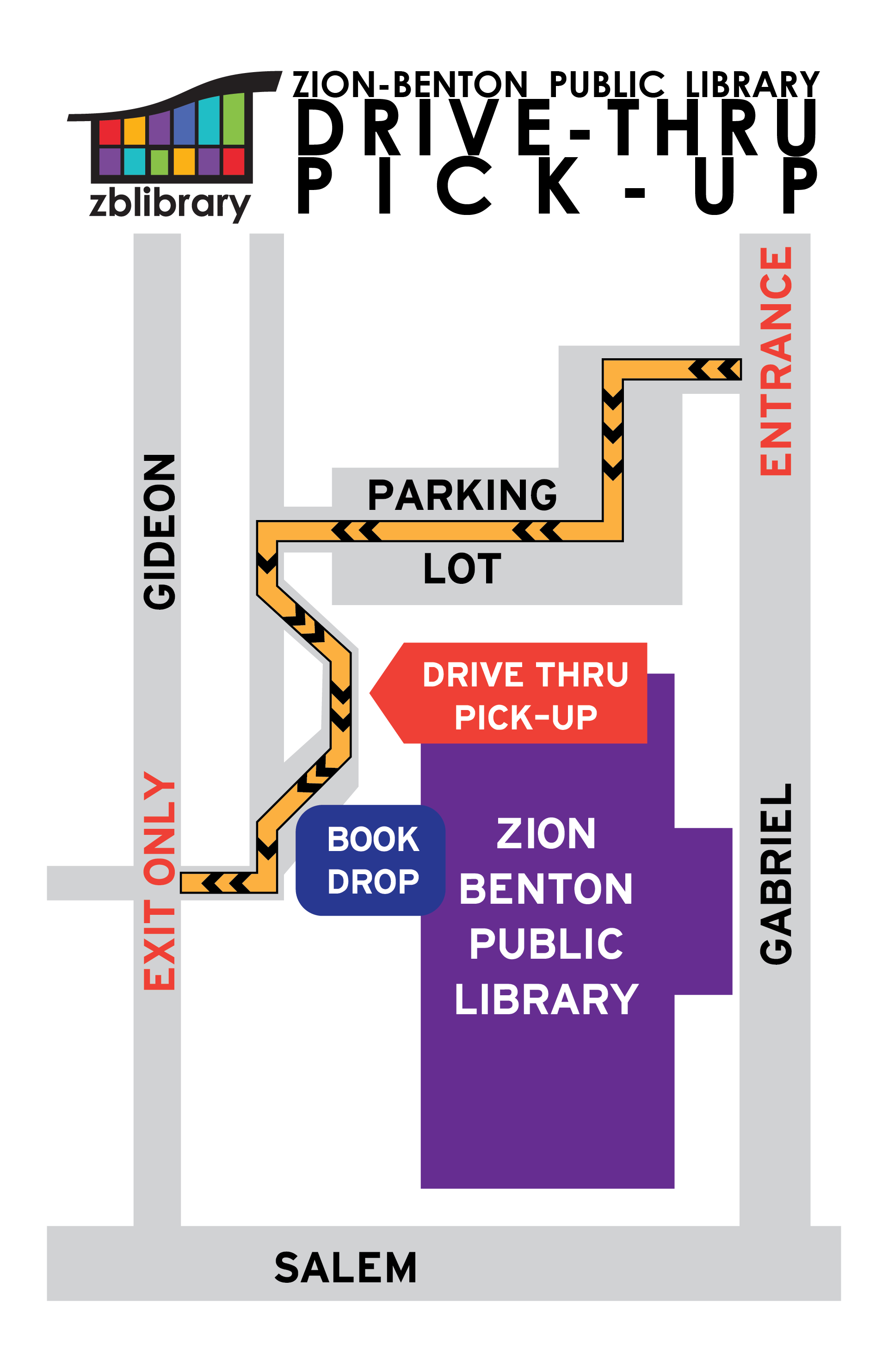 - Follow the signs to the back area where the BOOK DROP is located.