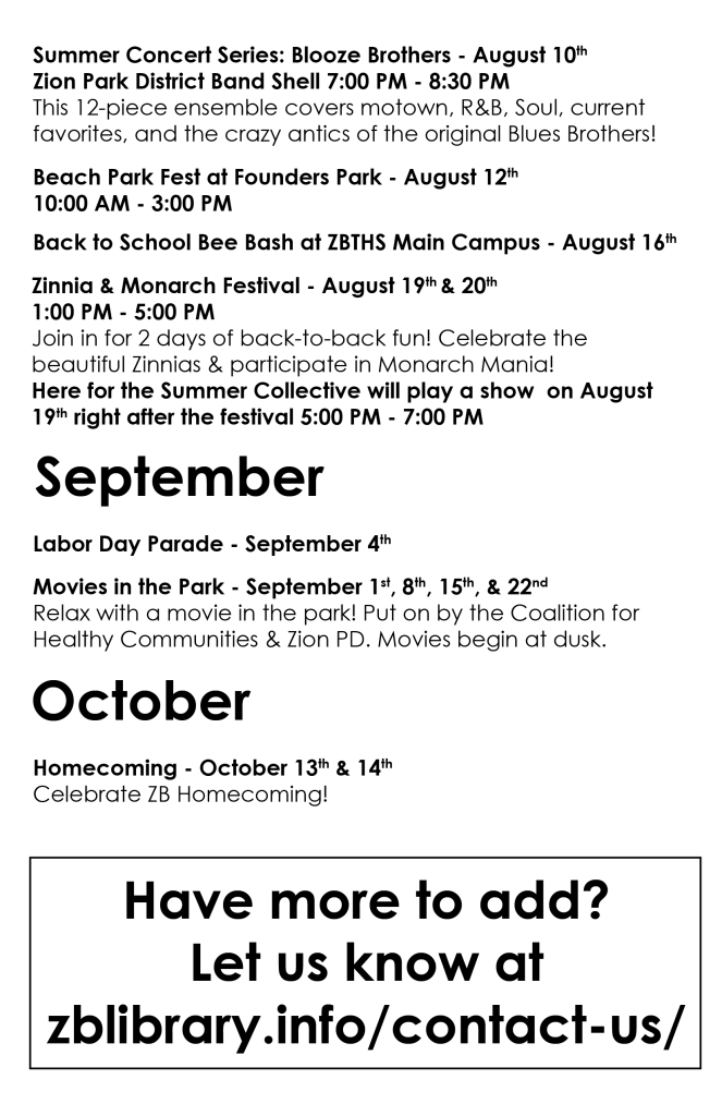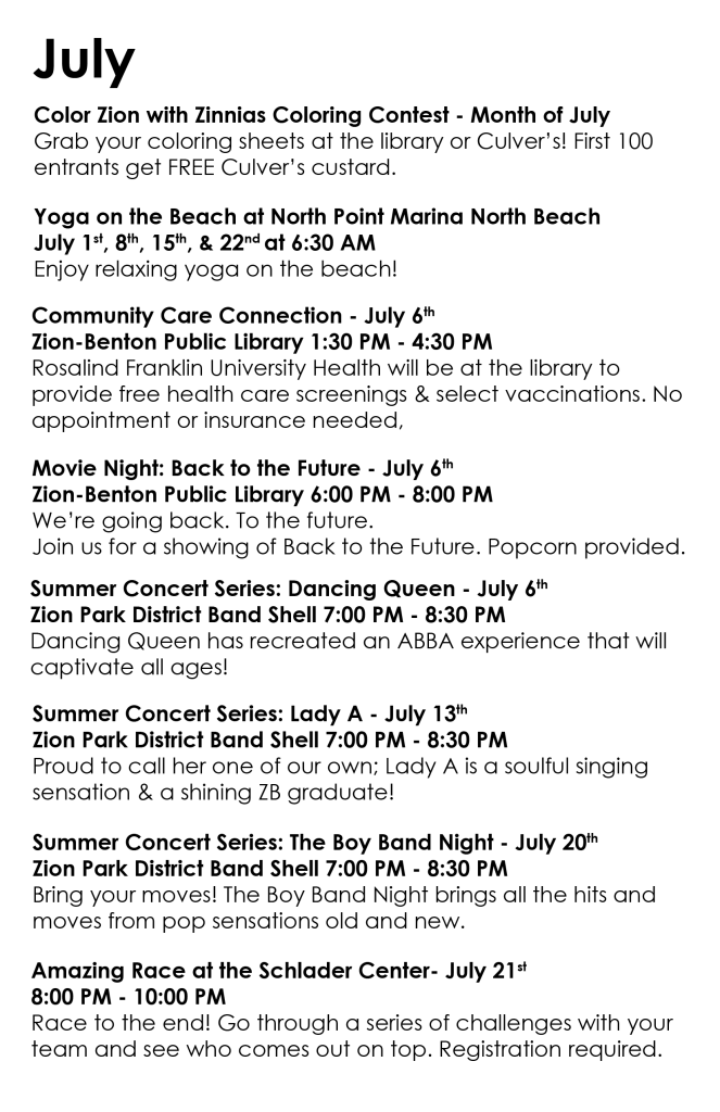 Download the packet of events happening through the summer in Zion, Beach Park, & Winthrop Harbor!